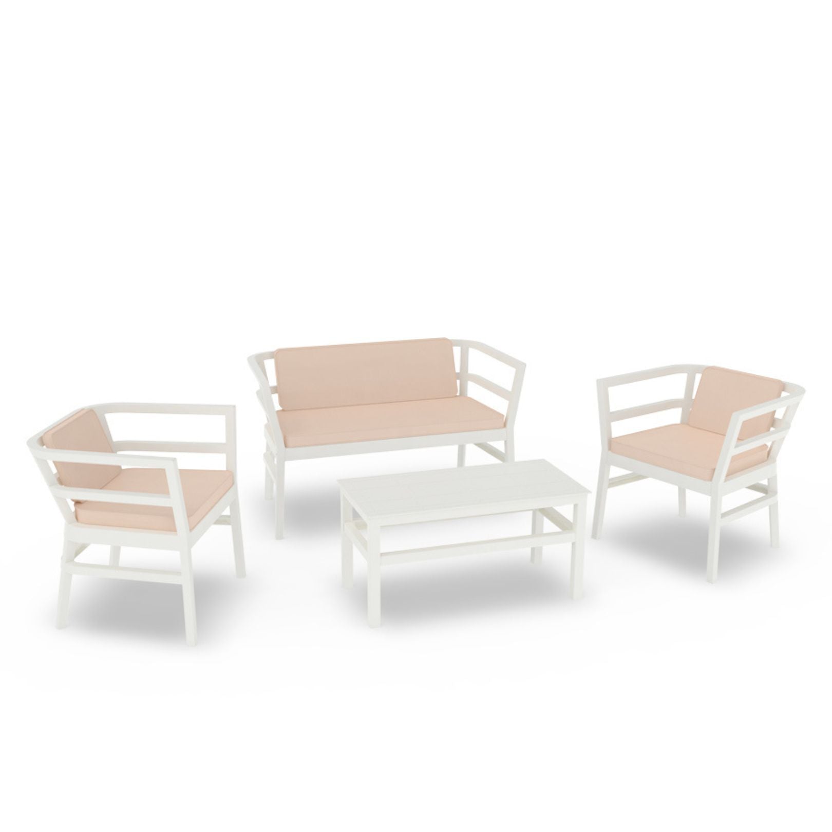 El conjunto está compuesto por 1 sofá doble, 2 sillones, 1 mesa y 3 cojines color beige, ofreciendo una solución completa para crear ambientes confortables y funcionales.